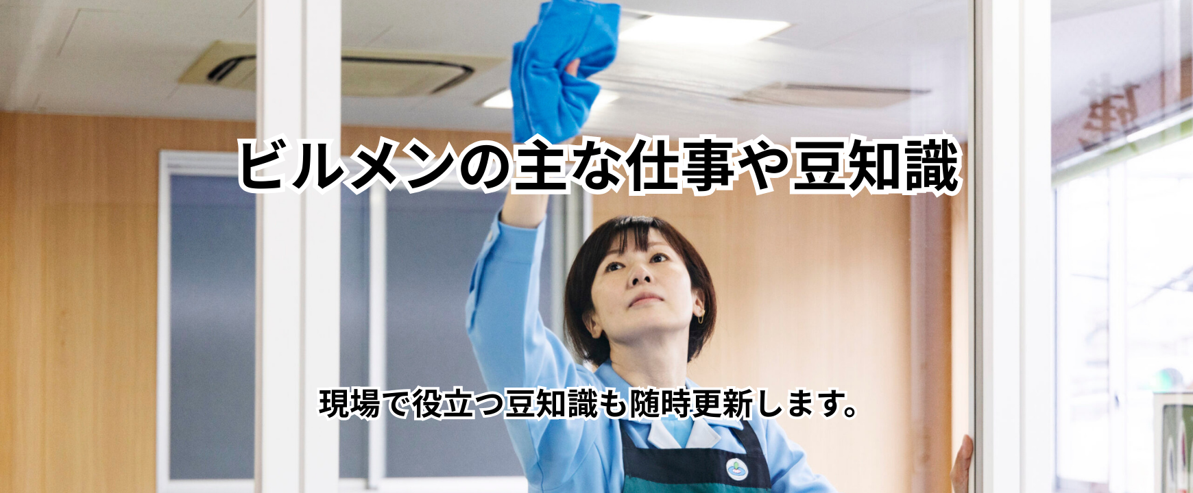日常清掃・定期清掃の範囲に含まれない箇所(例えば照明器具、ブラインド、内外壁面など)の清掃を行い、1年でも長くお客様の建物を使っていただくためのサポートをするお仕事です。